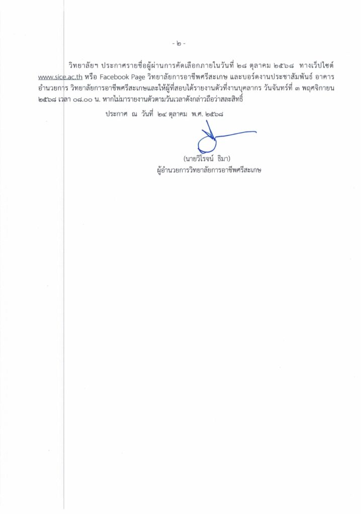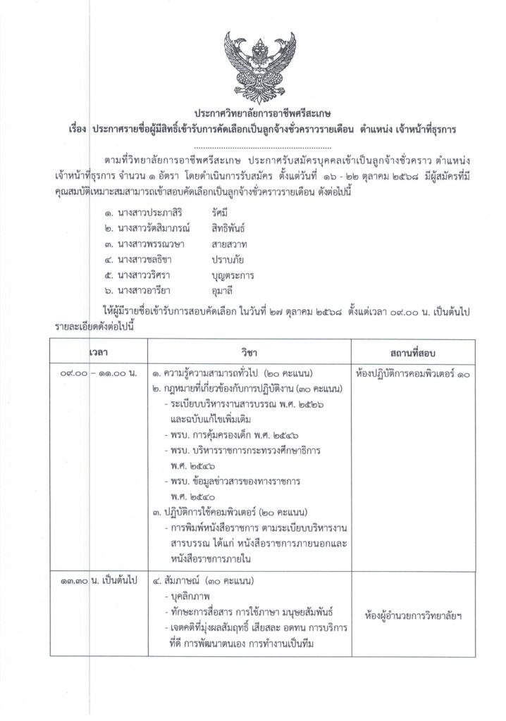 ตามที่วิทยาลัยการอาชีพศรีสะเกษ ประกาศรับสมัครบุคคลเข้าเป็นลูกจ้างชั่วคราว ตำแหน่ง เจ้าหน้าที่ธุรการ จำนวน 1 อัตรา โดยดำเนินการรับสมัคร ตั้งแต่วันที่ 16 – 22 ตุลาคม 2568 มีผู้สมัครที่มีคุณสมบัติเหมาะสมสามารถเข้าสอบคัดเลือกเป็นลูกจ้างชั่วคราวรายเดือน ดังต่อไปนี้