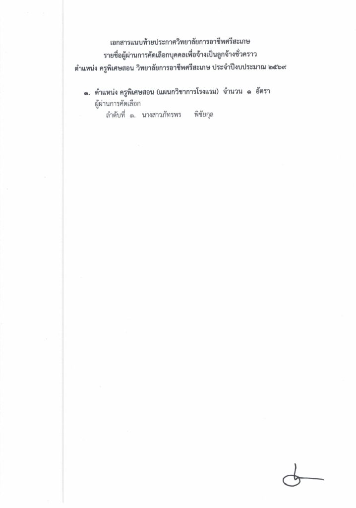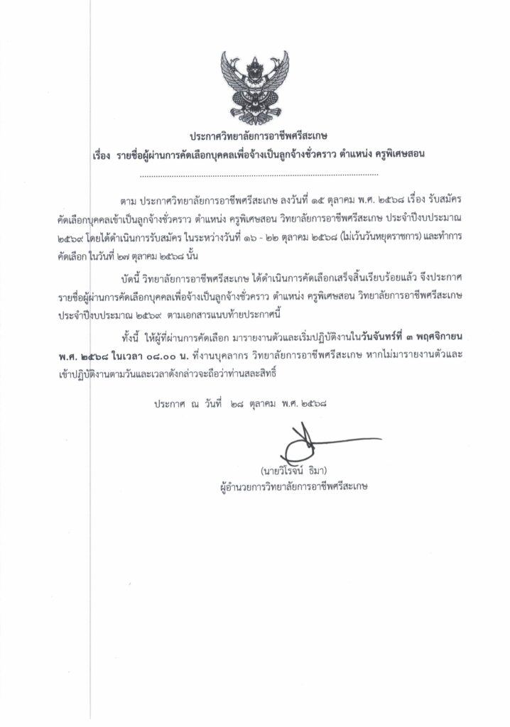 ตาม ประกาศวิทยาลัยการอาชีพศรีสะเกษ ลงวันที่ 15 ตุลาคม พ.ศ. 2568 เรื่อง รับสมัครคัดเลือกบุคคลเข้าเป็นลูกจ้างชั่วคราว ตำแหน่ง ครูพิเศษสอน วิทยาลัยการอาชีพศรีสะเกษ ประจำปีงบประมาณ 2569 โดยได้ดำเนินการรับสมัคร ในระหว่างวันที่ 16 – 22 ตุลาคม 2568 (ไม่เว้นวันหยุดราชการ) และทำการคัดเลือก ในวันที่ 27 ตุลาคม 2568 นั้น