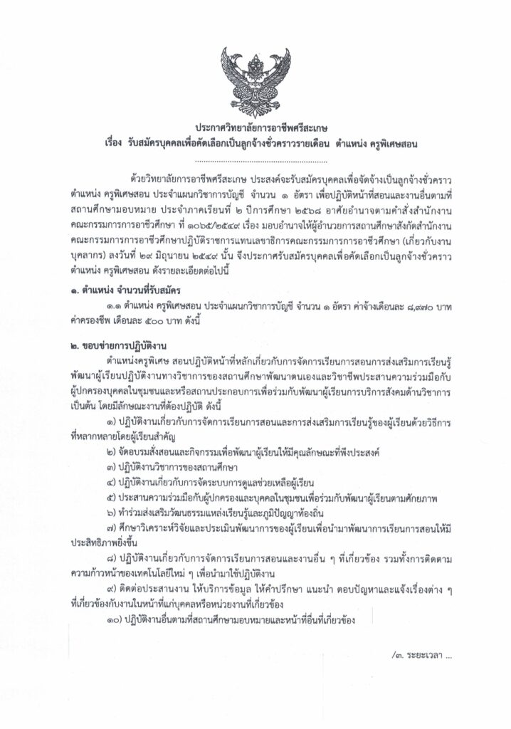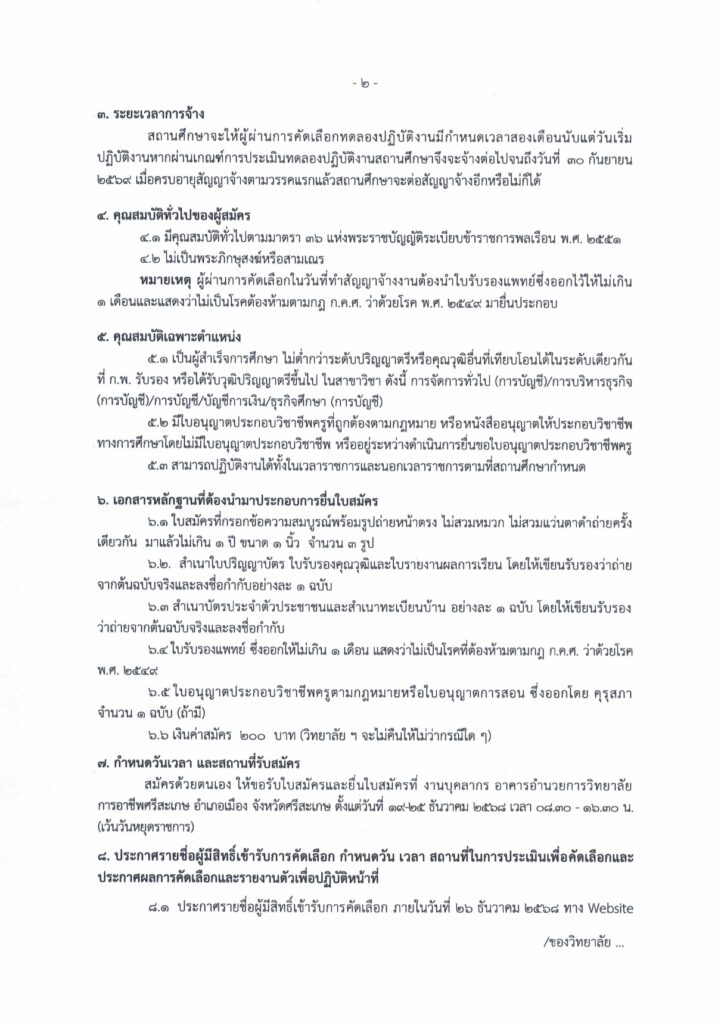 วิทยาลัยการอาชีพศรีสะเกษ ประกาศรับสมัครบุคคลเพื่อคัดเลือกเข้าเป็นลูกจ้างชั่วคราว ตำแหน่ง ครูพิเศษสอน จํานวน 1 อัตรา รับสมัครตั้งแต่วันที่ 19 – 25 ธันวาคม 2568